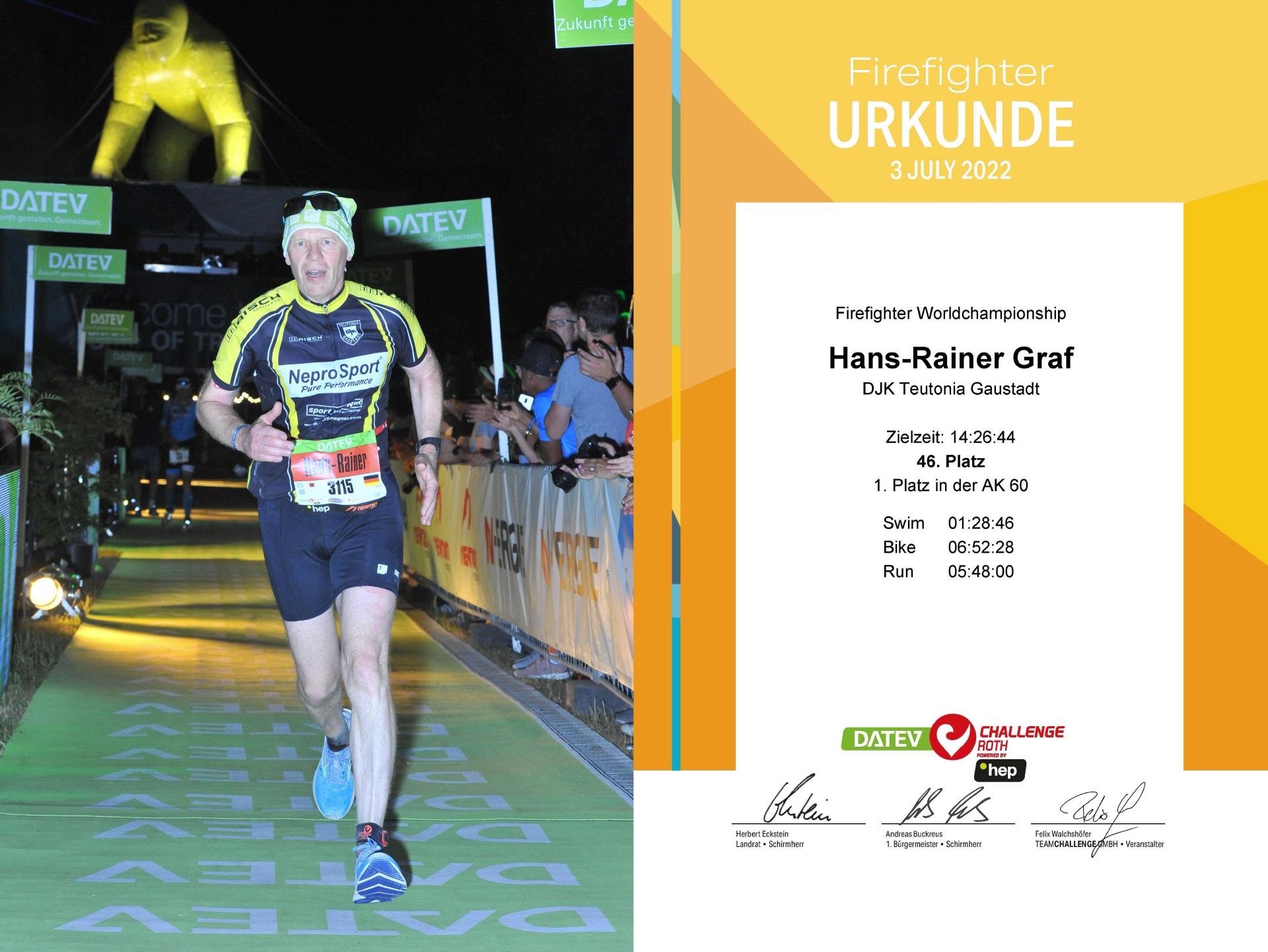 Ich hab meine wichtigsten Ziele erreicht: Unverletzt bleiben, Ankommen, Weltmeister werden (in der Klasse der Feuerwehrleute).